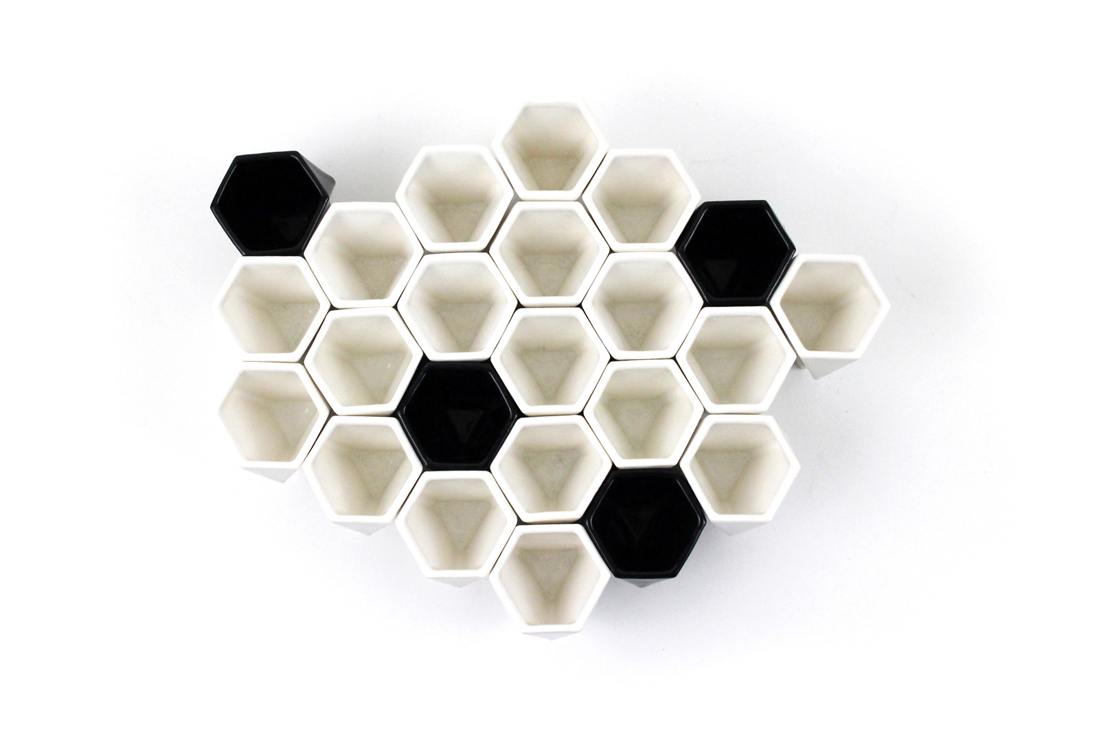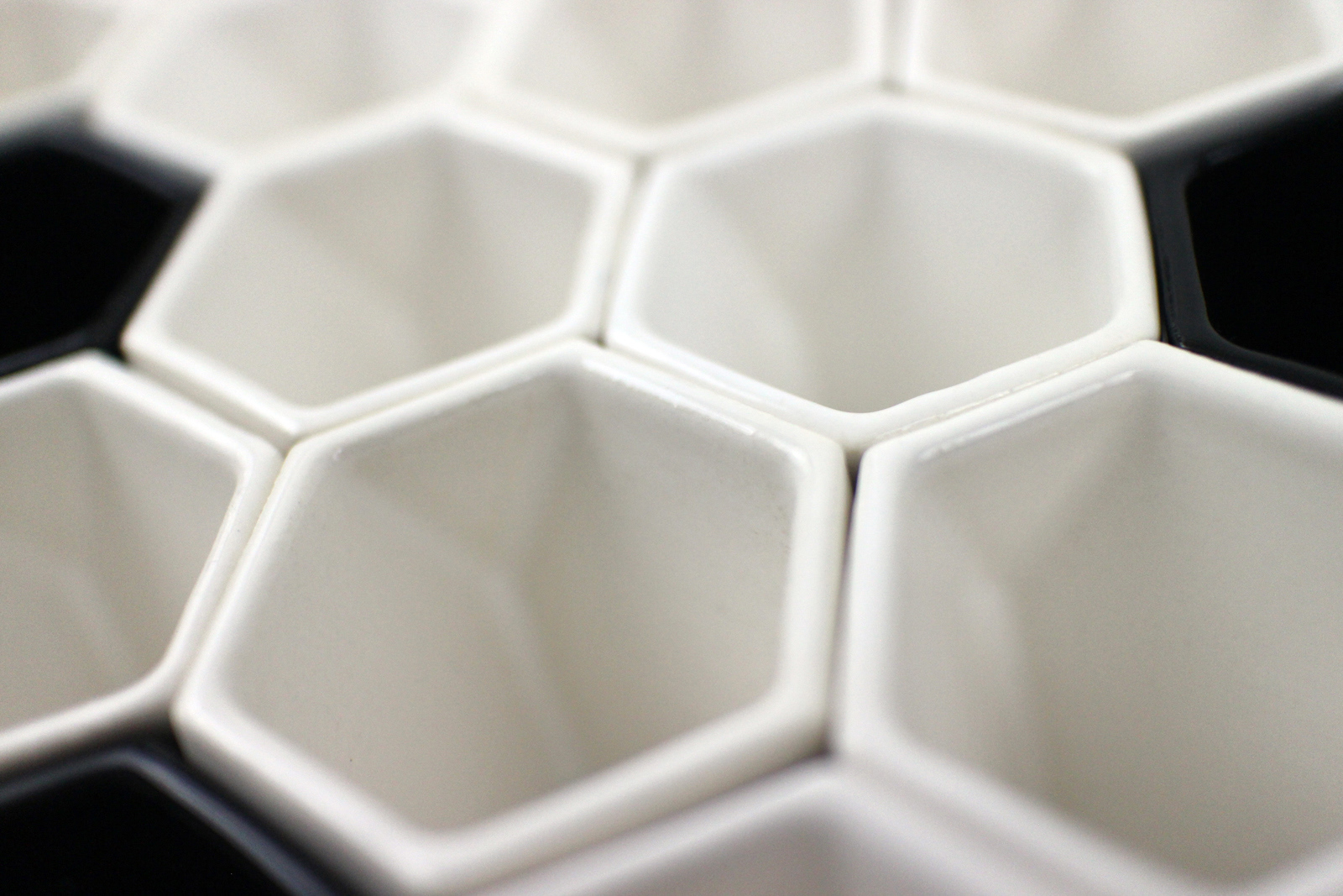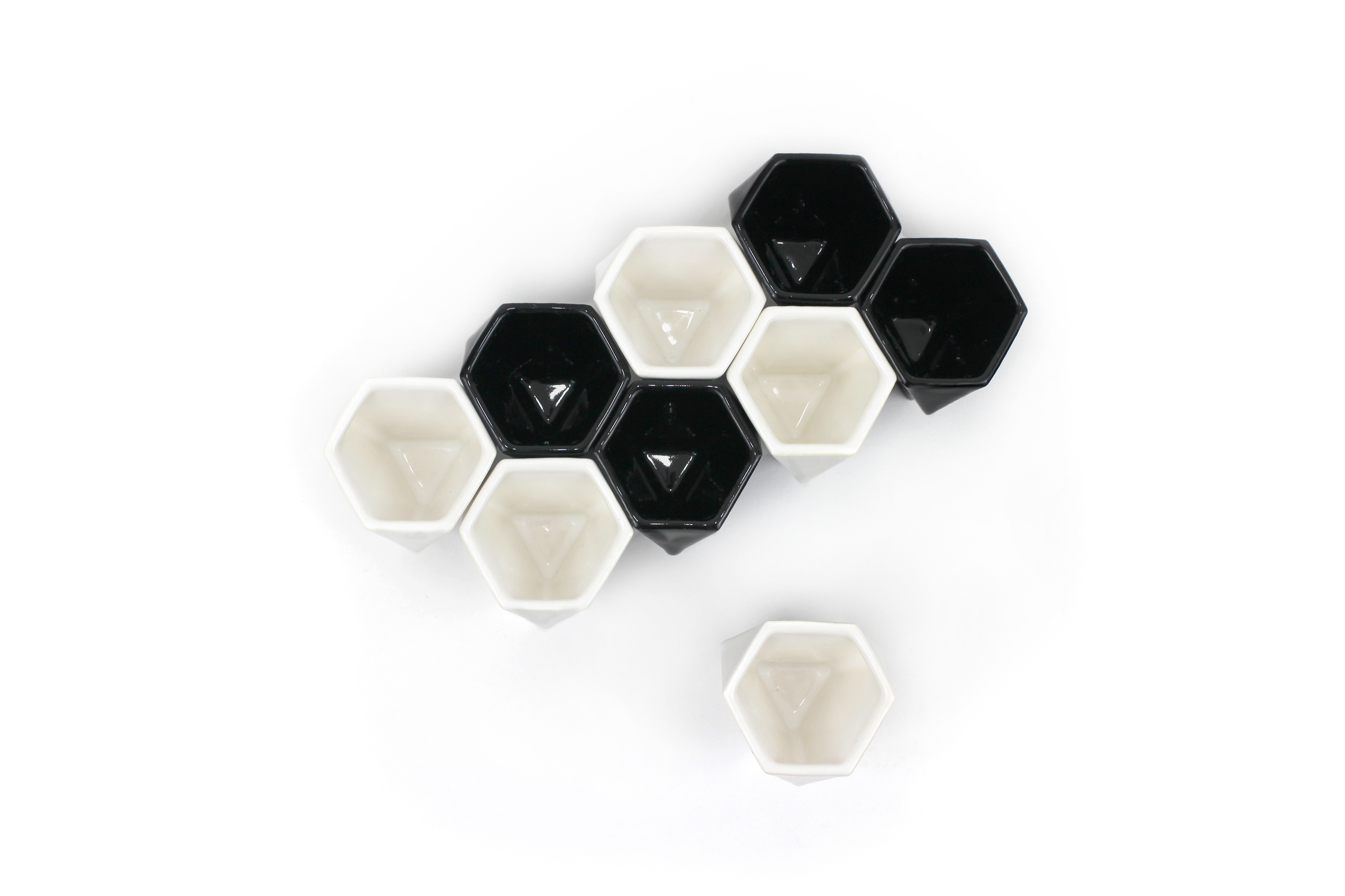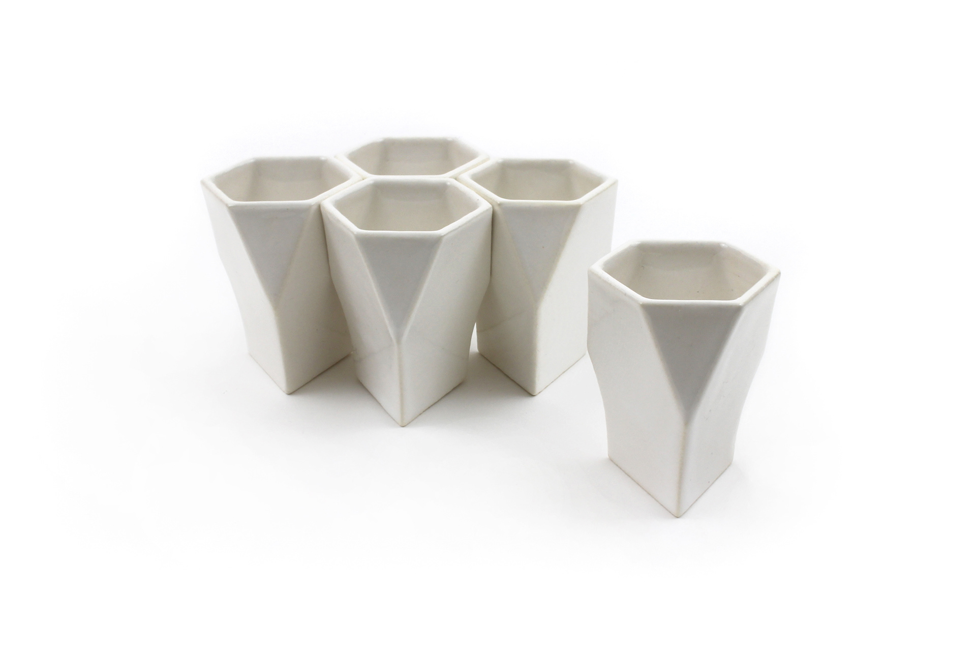 A set of geometric shot glass design which draws a continuous honeycomb pattern on the top.