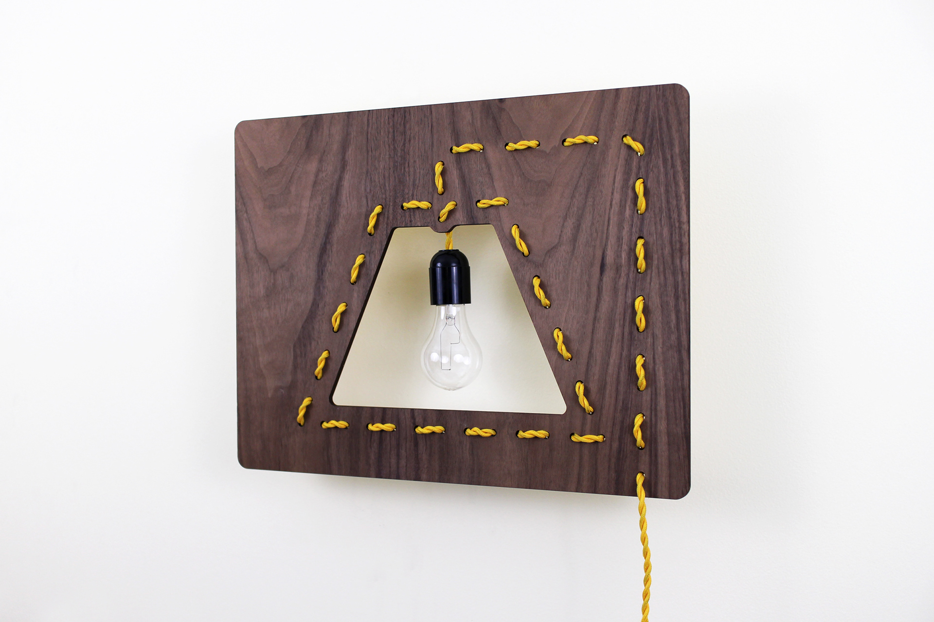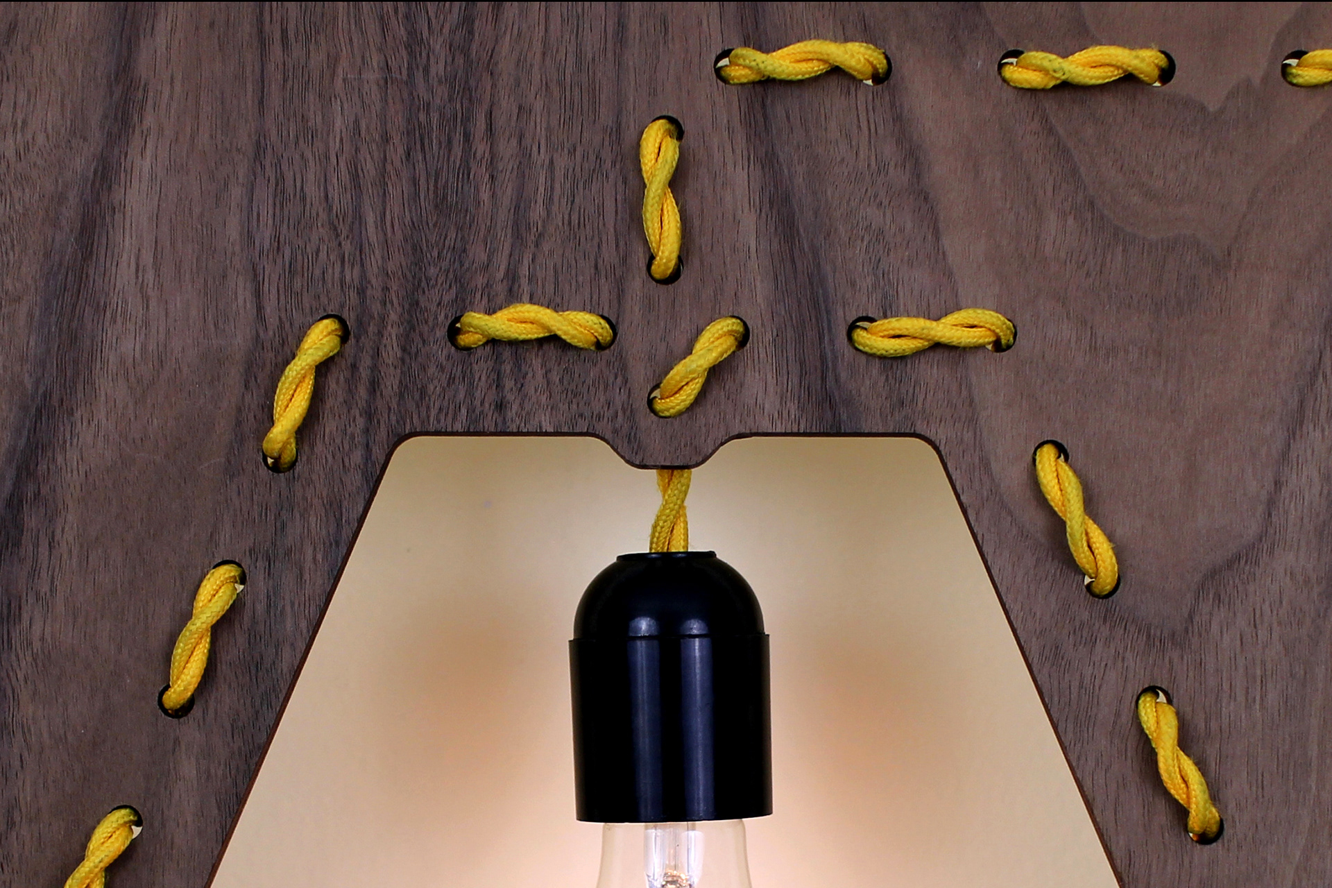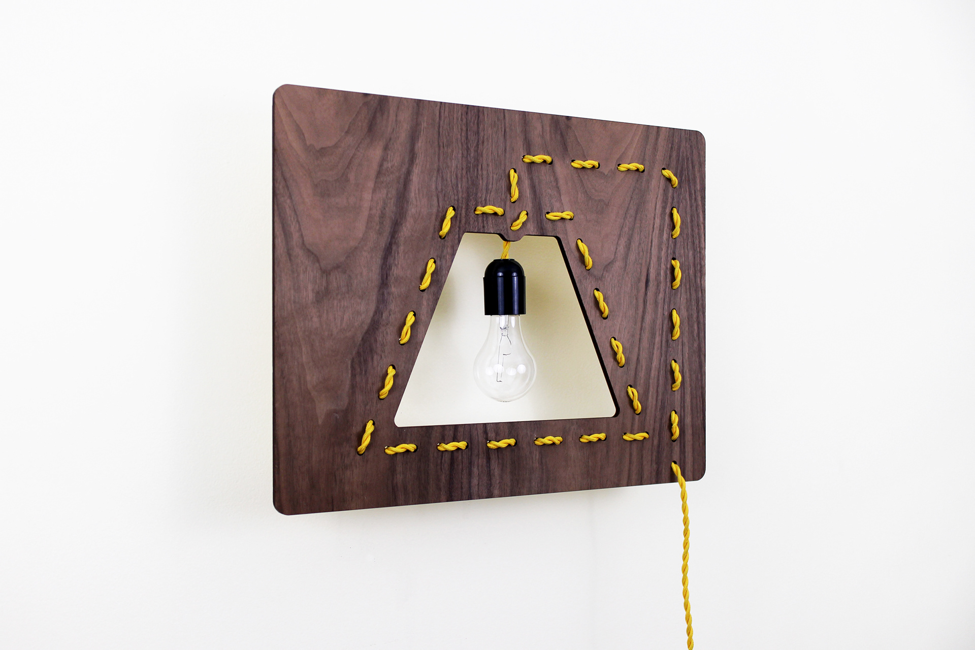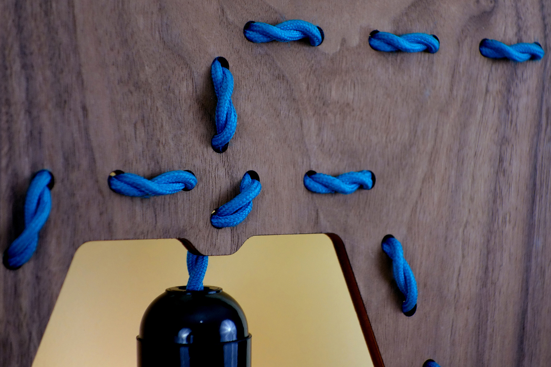 Wall mount lighting design with vivid color electric cord and laser cut walnut board.