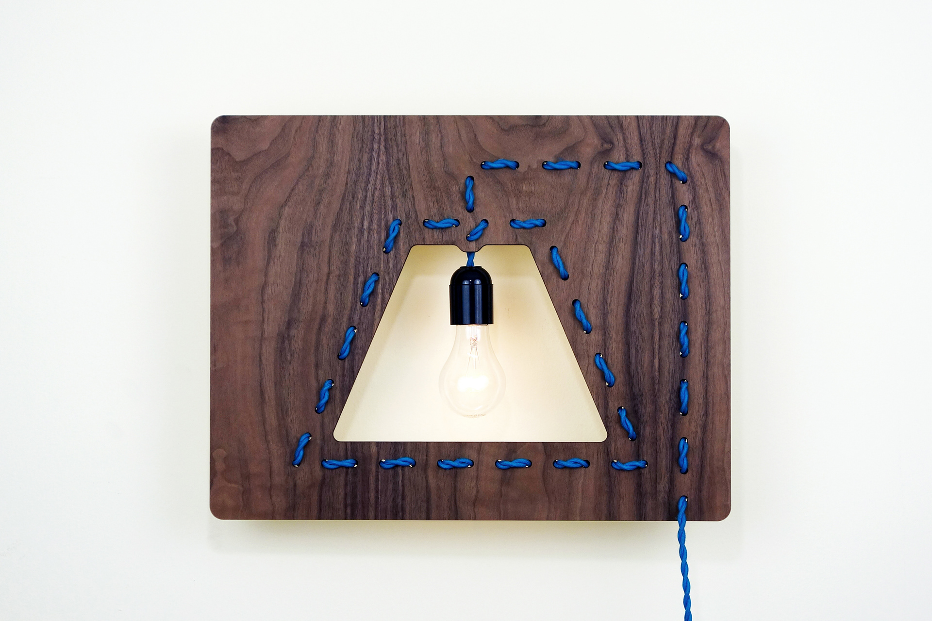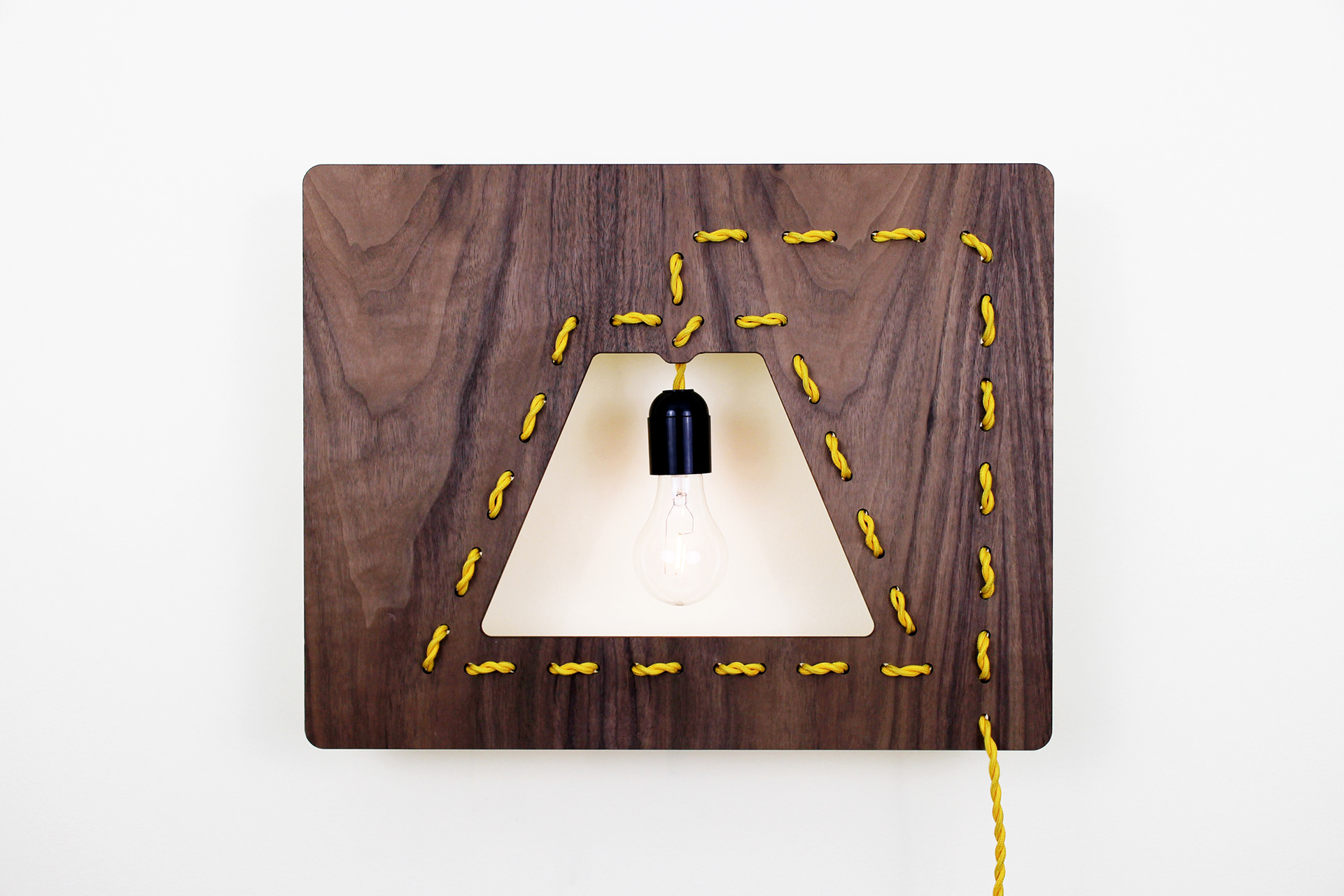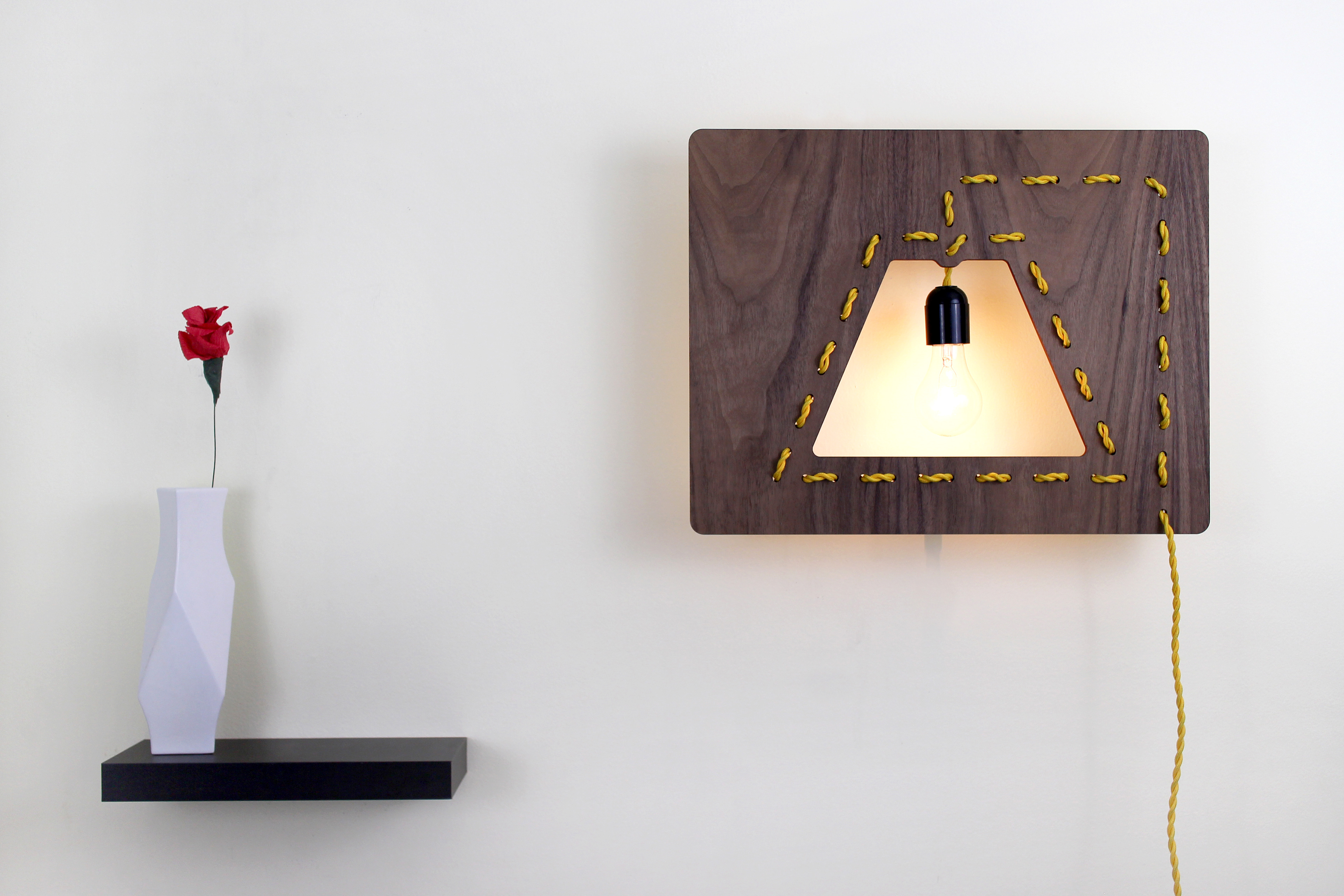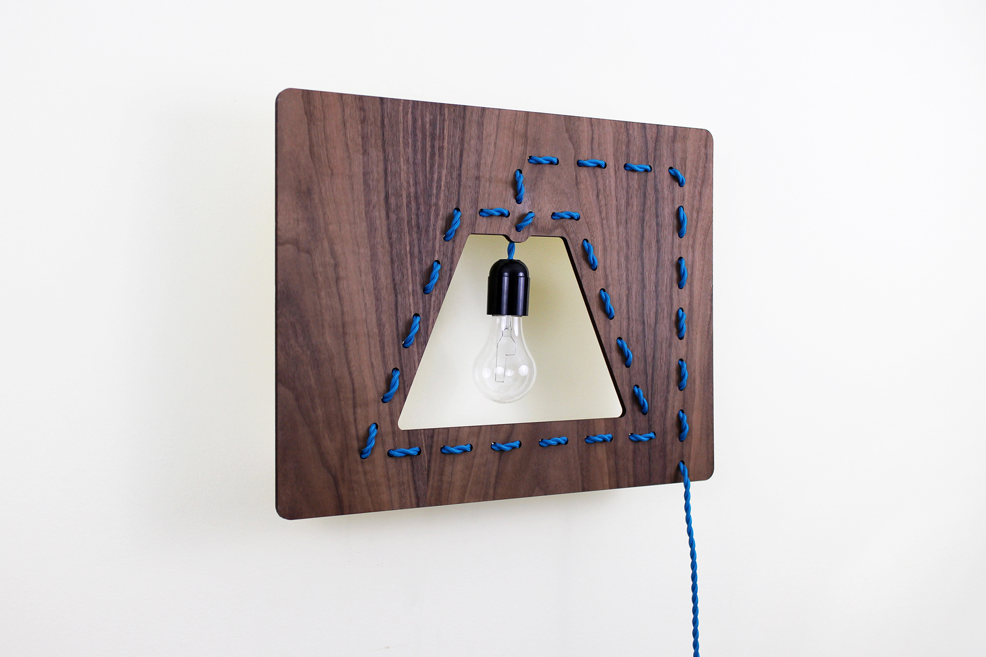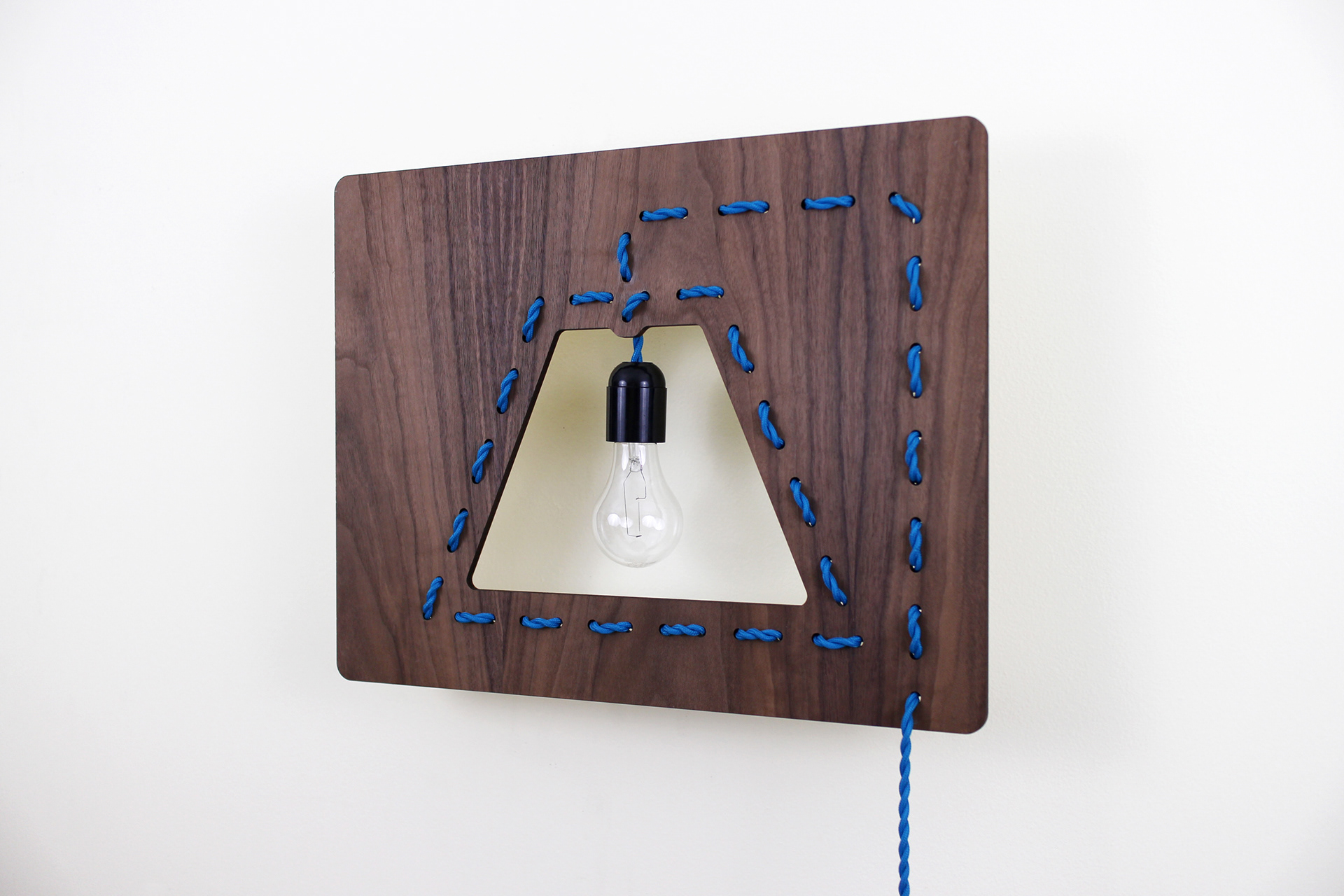 Wall mount lighting design with vivid color electric cord and laser cut walnut board.
